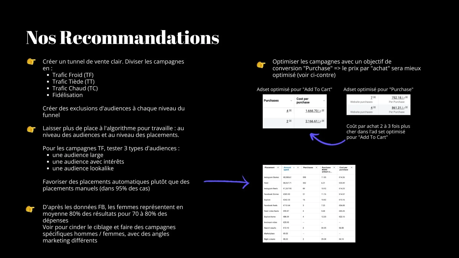 20 à 40 pages d’analyses de vos campagnes publicitaires, résumées par des actions concrètes à mettre en place pour optimiser vos investissements publicitaire et augmenter votre rentabilité.